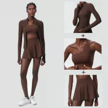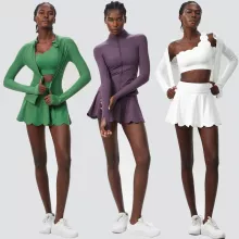 • 3-Piece Set: Includes a supportive top, a long-sleeve outer layer, and a skirt with built-in shorts.