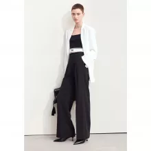 What sets these pants apart is their perfect blend of comfort, style, and functionality. The slight stretch in the fabric ensures a snug yet flexible fit, allowing you to move freely. The wide-leg design not only offers a contemporary and stylish look but also provides extra comfort. Additionally, the decorative elements such as the pockets, pleats, and fake zippers add a unique touch that enhances the overall design.