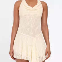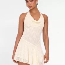 Slip into sultry summer style with this backless lace cowl neck mini dress – the ultimate showstopper for parties, club nights, and tropical getaways. Designed with a halter neckline and an open back, this dress strikes the perfect balance between sexy and chic. The lace detail adds a soft feminine touch, while the curve-hugging silhouette enhances your natural shape with just the right amount of stretch.
