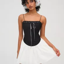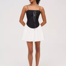 The eye-catching black and white patchwork detail adds visual intrigue, while the low waist silhouette and short length enhance your natural shape. Made from a soft cotton blend, it feels lightweight and breathable on your skin—keeping you cool and confident no matter how high the temperatures climb. Whether you’re hitting a rooftop party, heading to the beach boardwalk, or stepping out for cocktails, this dress is your go-to statement piece of the season.