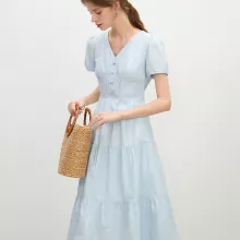 Step into timeless charm with this elegant blue cotton dress designed to capture the lightness and beauty of summer. Featuring a flattering V-neckline, a softly structured A-line silhouette, and a feminine tiered skirt, this piece is your answer to effortless everyday style. The embroidered bow detail adds a subtle touch of craftsmanship, while the empire waist enhances your natural curves for a polished yet relaxed look.