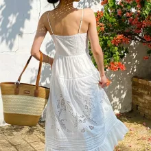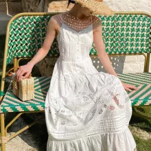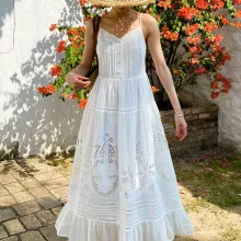 This dress features a flattering V-neckline, delicate lace-up closure, and eye-catching patchwork embroidery that gives it a unique bohemian flair. The sleeveless camisole cut offers freedom of movement, while the mid-calf length adds a touch of refined sophistication.