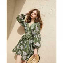 The dress showcases a flattering A-line silhouette that complements the natural waistline, creating a graceful profile that suits all body types. With its elegant full-length sleeves and stylish V-neck, the dress combines modesty with a touch of allure. The above-knee length adds a playful, youthful vibe, perfect for those sunny days out or a casual evening get-together.