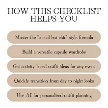 - Capsule Wardrobe Building: Get a list of must-have items, a quick checklist, and a mix-and-match wardrobe table for endless outfit combinations.