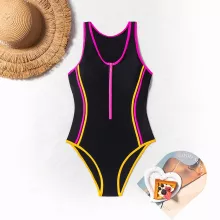 Featuring a flattering V-neckline and front zipper detail, this swimsuit sculpts your silhouette while allowing for easy wear and removal. The contrast color design adds a dynamic, energetic vibe, while the sleeveless cut and wide shoulder straps ensure unrestricted movement. The soft, stretchy fabric hugs your body like a second skin, while built-in padded cups give you shape and support where you need it most.