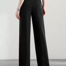 Crafted from a breathable woven fabric blend of polyester and spandex, these pants offer a smooth, structured drape without any stiffness. The mid-rise waist flatters your natural shape, while the straight-leg cut elongates your silhouette. The tailored pleated front adds sophistication, and the full-length design (approximately 40 inches) makes them ideal for pairing with heels or flats. Practical details like side pockets and faux zipper accents lend a refined touch to their minimalist style.