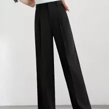 Crafted from a breathable woven fabric blend of polyester and spandex, these pants offer a smooth, structured drape without any stiffness. The mid-rise waist flatters your natural shape, while the straight-leg cut elongates your silhouette. The tailored pleated front adds sophistication, and the full-length design (approximately 40 inches) makes them ideal for pairing with heels or flats. Practical details like side pockets and faux zipper accents lend a refined touch to their minimalist style.