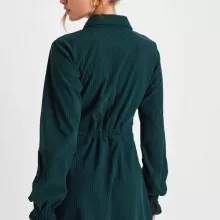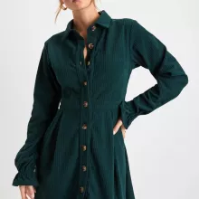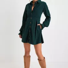 What sets this dress apart is its ability to seamlessly blend elegance with practicality. The luxurious corduroy fabric, combined with a timeless A-line cut, gives you a tailored look without compromising comfort. The turn-down collar and button-up closure lend a classic, office-ready vibe, while the playful mini length keeps it fun and youthful. Whether you’re wearing it to a meeting or out for an evening with friends, this dress has you covered in style.