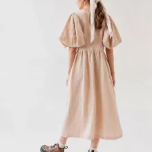 The loose, A-line silhouette paired with an adjustable bandage-style bust (fitting 31″–45″) ensures a comfortable and flattering fit for a variety of body types. Its natural waistline and mid-calf length strike the perfect balance between relaxed and refined. Non-stretch but flowy, it moves beautifully with every step you take, making it an easy choice for warm-weather occasions.