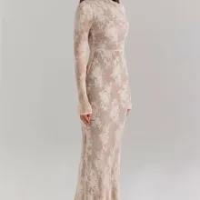 The lace detailing and high collar elevate this dress beyond a typical maxi, making it a statement piece that combines timeless elegance with modern style. Its slight stretch provides comfort without compromising on its form-fitting silhouette, ensuring you feel as good as you look.