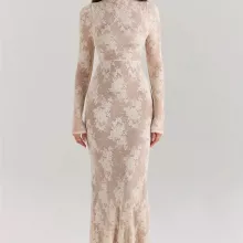 The lace detailing and high collar elevate this dress beyond a typical maxi, making it a statement piece that combines timeless elegance with modern style. Its slight stretch provides comfort without compromising on its form-fitting silhouette, ensuring you feel as good as you look.