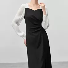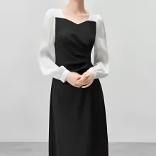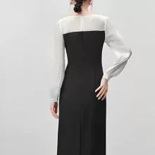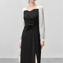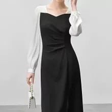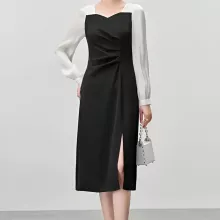 Elegant Patchwork Contrast Dress – Fitted Draped Split Dress for Fall 2024