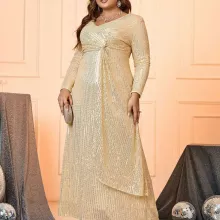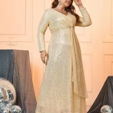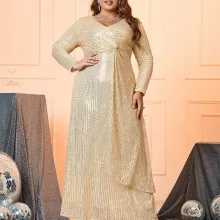 Make an unforgettable entrance in this Elegant Plus Size Sequin Formal Dress. Designed to enhance your natural beauty, this ankle-length dress combines the sophistication of a V-neckline with the allure of subtle sequins. Its A-line silhouette and long sleeves add a touch of timeless elegance, making it perfect for formal events, evening parties, or special celebrations. Crafted with a slight stretch for comfort, this dress allows you to move with grace while looking effortlessly stunning.