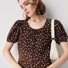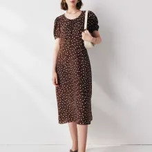 Step into sophistication with this elegant polka dot silk dress, designed for the modern woman who values comfort and timeless style. Made from 100% mulberry silk, this luxurious crepe dress drapes beautifully, offering a soft, breathable feel that keeps you cool and comfortable during the warmer months. The classic A-line silhouette flatters every figure, while the empire waistline enhances your natural shape. Whether you’re heading to the office, a brunch date, or an evening event, this dress is your go-to for effortless elegance.