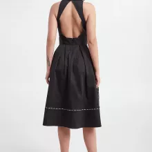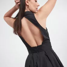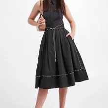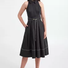 Crafted in a breathable cotton blend with a hint of elastane, it moves with you while keeping its shape beautifully. The structured silhouette features a round neckline and a traditional collar for a polished finish. Sleek front pockets add both function and style, while the discreet zip closure ensures a flawless fit. It’s the kind of dress that speaks volumes—without saying a word.