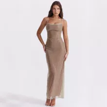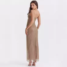What sets this dress apart is its seamless blend of style and comfort. The glittery finish adds a dash of sparkle without being overbearing, while the backless design and high split bring a hint of drama and allure. With its slim-fit silhouette and attention to detail, this dress is a must-have for women who want to exude confidence and sophistication.