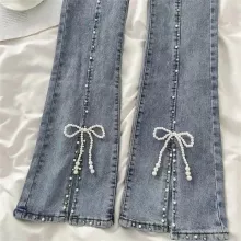Our jeans aren’t just about looking good — they’re about feeling fantastic, too. The elastic high waist cinches at just the right spot, creating a flattering silhouette that celebrates your curves. The stretch factor? Non-existent, because we believe in keeping things comfortably secure. The playful bow and pearl detailing add a unique touch that sets these trousers apart from your regular denim, making them a special piece in your collection.