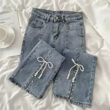 Our jeans aren’t just about looking good — they’re about feeling fantastic, too. The elastic high waist cinches at just the right spot, creating a flattering silhouette that celebrates your curves. The stretch factor? Non-existent, because we believe in keeping things comfortably secure. The playful bow and pearl detailing add a unique touch that sets these trousers apart from your regular denim, making them a special piece in your collection.