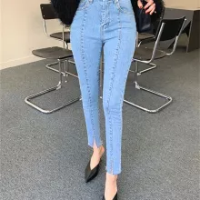 Experience the blend of style, comfort, and unique design with our High-Waisted Slim-Fit Spliced Jeans with Split Zippers. Shop now and elevate your casual wear with a touch of modern sophistication.