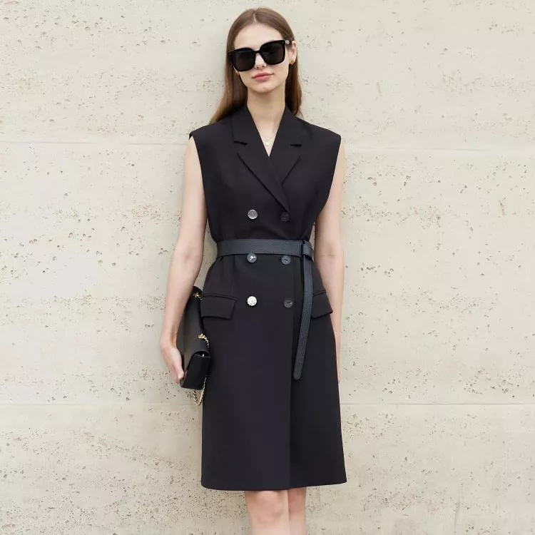 The simple yet elegant design features a classic round neckline, a sleeveless silhouette, and a traditional button fastening, creating a versatile piece that can be dressed up or down. The clean black color ensures that this dress pairs beautifully with any accessories, from bold statement jewelry to minimalist sandals, allowing you to customize your look effortlessly.