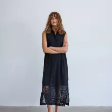 This black sleeveless dress is the perfect balance of comfort, style, and practicality. Whether you’re lounging on a warm day or attending a garden party, its breathable fabric ensures you stay cool and comfortable all day long. The classic round neck and button-up detail give it a refined touch, while the sleeveless design adds to its laid-back yet sophisticated charm. Easy to slip on and perfect for those moments when you need to look polished without overthinking your outfit.