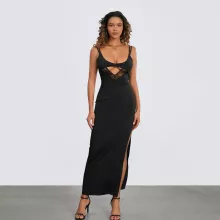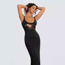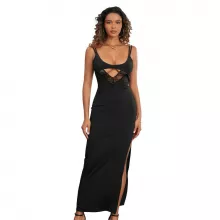 This dress stands out due to its unique combination of fashion-forward elements and practical comfort. The low-cut cutout front and thigh-high slit are balanced perfectly with the secure and adjustable spaghetti straps, making it as functional as it is stylish. The intricate lace patchwork not only enhances its visual appeal but also showcases meticulous attention to detail.