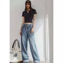 Our jeans feature a drawstring waistband, ensuring a perfect fit every time. The ankle-length cut and loose fit provide a flattering silhouette that complements any body type. The light blue wash gives these jeans a fresh and airy feel, making them a versatile addition to your wardrobe.