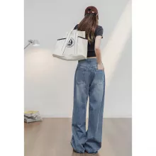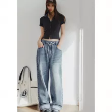 These jeans stand out with their unique combination of vintage style and modern comfort. The drawstring waistband ensures a customizable fit, while the loose, wide-leg cut flatters every figure. The light blue wash and bleached accents add a trendy touch that makes these jeans a standout piece in any wardrobe.