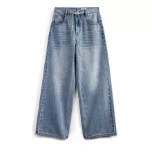These jeans stand out with their unique combination of vintage style and modern comfort. The drawstring waistband ensures a customizable fit, while the loose, wide-leg cut flatters every figure. The light blue wash and bleached accents add a trendy touch that makes these jeans a standout piece in any wardrobe.