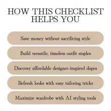 Want to turn heads and look luxe without overspending? The Look Luxe for Less checklist is your ultimate step-by-step digital guide to achieving designer-inspired style at a fraction of the cost. Packed with practical strategies, insider fashion hacks, and a proven capsule wardrobe formula, this downloadable checklist helps you master the art of looking expensive on a budget. Whether you’re revamping your closet, shopping for smart dupes, or learning how to accessorize like a pro, this resource is designed to make Style on a Budget: Look Luxe for Less not just possible, but easy and fun.