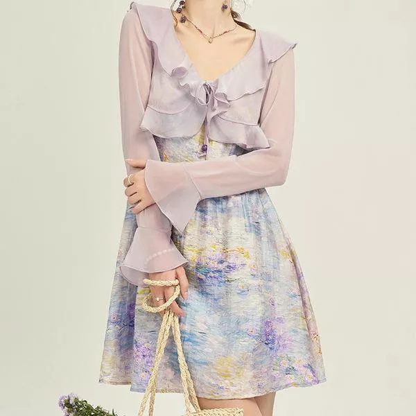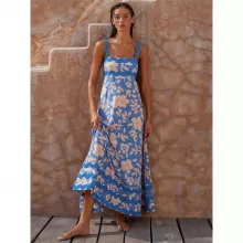 This stunning dress features delicate spaghetti straps and a graceful slash neckline that highlights the shoulders and creates a flattering silhouette. Made from a soft cotton blend with a touch of stretch, it offers both comfort and a perfect fit. The flounced edge adds a playful, yet refined touch to this beautiful piece.