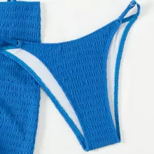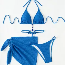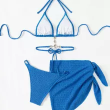 Turn heads wherever you go with this stunning 3-piece blue swimsuit set, designed to bring luxury, style, and comfort to your beach days and vacation moments. Featuring a brilliant solid blue hue and glimmering rhinestone chain details, this bikini set is your go-to for standing out in the sun. The set includes a halter-style string bikini top, a matching high-waist bottom, and a chic sheer beach skirt that ties at the side for a flirty finish.