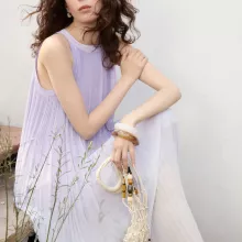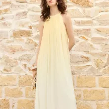 This dress is crafted from 100% polyester chiffon, offering a slightly stretchy and breathable feel for ultimate comfort. The halter neckline keeps the look clean and flattering, while the empire waist enhances your shape without clinging too tightly. A pullover design ensures an easy fit with no fuss, and the mid-calf length adds grace to every step. The dress is finished with subtle button detailing and an airy A-line silhouette that flatters all body types.