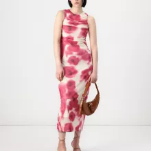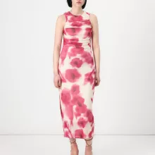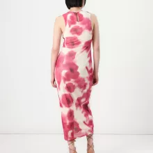 Featuring a vibrant fuchsia color and a trendy print pattern, this dress is sure to add a pop of color to your spring and summer looks. The sleeveless design and round neckline keep things fresh and breezy, ideal for staying cool during the hotter months. The button fastening at the back adds a modern touch while ensuring a secure and flattering fit.