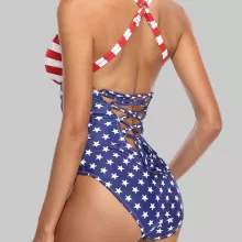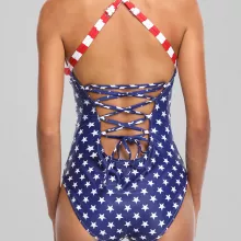 Crafted with a blend of 82% polyester and 18% spandex, this monokini hugs your body just right. The padded, wire-free push-up bra provides gentle support and enhances your natural shape, while the elastic waist ensures a secure, flexible fit. The fabric is lightweight, stretchy, and quick-drying—perfect for long beach days and poolside lounging. A classic one-piece cut with a patriotic twist makes this suit flattering on all body types.