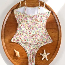 Unlike ordinary swimsuits, this piece combines a modern, high-fashion print with a curve-enhancing cut. The low waist and thong back create a striking silhouette that radiates confidence. The bandeau neckline and bandage design add a sultry edge while keeping things elegant and secure. Designed with care and attention to detail, this swimsuit flatters your body while letting your personality shine.