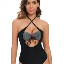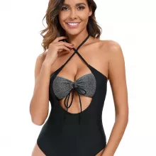 Its unique patchwork design and hollow-out details offer a blend of minimalism and allure. The halter neckline and backless cut add a sultry vibe, while the high-waist fit provides tummy control and accentuates your natural curves. Whether you’re lounging by the pool or diving into summer adventures, this one-piece brings together style and support in a striking way.