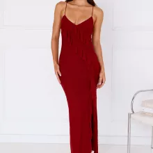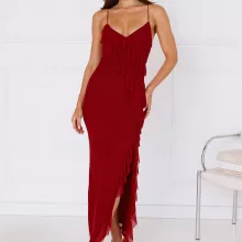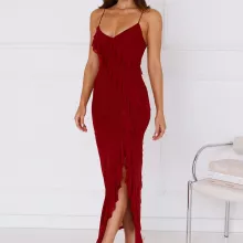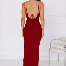 The sleek V-neckline, lace-up back, and high side split combine to create a bold yet graceful silhouette that captures attention from every angle. Lightweight polyester-spandex blend fabric gently caresses the skin, making it perfect for spring and summer days when you want to keep cool but stay chic. The ruffle detail adds a playful touch, while the sleeveless, backless design turns up the heat.