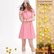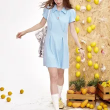 Crafted from a soft cotton and polyester blend, this woven dress is light and breathable — perfect for summer heat. The turn-down collar adds a tailored feel while the button details give it an extra touch of charm. With its regular fit and short sleeves, it’s comfortable yet polished. The dress falls above the knee for a flirty mini length, while the A-line cut provides ease of movement and a feminine shape.