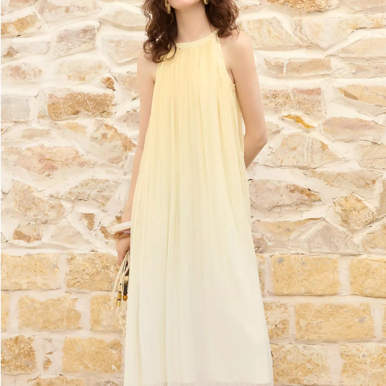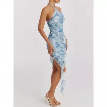 Crafted with care, the dress features a flattering halter neckline and a daring backless design, perfect for showcasing your summer glow. The dress hugs your curves just right due to its slim fit sheath silhouette, while the mid-calf length balances the allure with elegance. The ruffle detailing adds a touch of whimsy, ensuring you feel as good as you look.