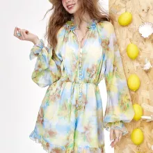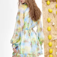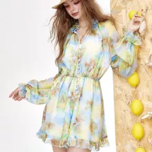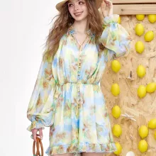 Crafted from lightweight, non-stretch polyester chiffon, this mini dress features an enchanting full print that captures the season’s carefree essence. The flattering A-line shape cinches at the waist for a defined silhouette, while the lantern sleeves and delicate three-dimensional embellishments add soft drama and a touch of fairycore fantasy. The V-neckline enhances the décolletage and elongates the neck, making it as flattering as it is fashionable.
