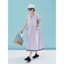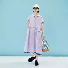 Summer Striped Cotton Mid-Length Dress with Sailor Collar and Pockets