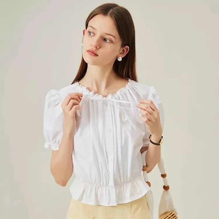 Elegant Egyptian Cotton Long-Sleeved Blouse with Detachable Ribbon