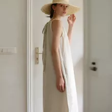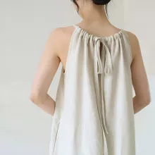 Crafted from premium linen, this piece is lightweight, breathable, and perfect for keeping cool while looking stylish during the warmest months. The halter neck ties delicately at the back, giving it a touch of feminine allure and adjustability. It’s the kind of dress that feels as good as it looks—easygoing yet elevated.