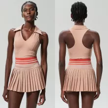 This activewear set includes a sleeveless, high-performance gym top paired with a flattering, flowy tennis skirt that features discreet utility pockets—perfect for holding your essentials while you’re on the go. Made from soft, quick-drying nylon, this outfit offers a comfortable, supportive fit with plenty of stretch and breathability. Its solid and striped color options give you versatile styling choices, while its flattering cut suits all body shapes. Best of all, it fits true to size, so just take your normal size and you’re good to go.