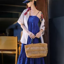 The Seersucker Slip Dress features a beautiful patchwork design that elevates its casual yet chic vibe. The crossed strap design adds an extra element of flair, while the hollow-out details give it a unique touch. The dress is made from a soft cotton blend fabric, providing a slight stretch for added comfort and freedom of movement. Whether you’re lounging at the beach, strolling through the city, or attending a casual dinner, this dress will keep you looking fashionable all season long.