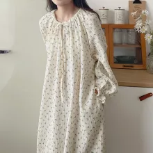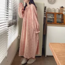 With a chic bandage lace-up detail at the neckline and full-length sleeves, this dress combines laid-back luxury with subtle styling elements. The printed pattern adds just enough interest without overpowering its minimalist vibe. Designed with a natural waistline and mid-calf length, it’s the kind of piece you’ll reach for over and over again when comfort and style are both non-negotiable.