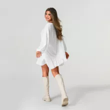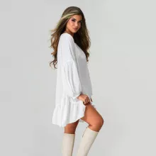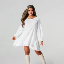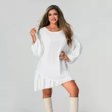 Made from a premium blend of 70% polyester and 30% cotton, the fabric is soft to the touch and gentle on sensitive skin. The crew neckline and long sleeves provide full coverage, while the asymmetric ruffled hem adds a playful, feminine touch. This pullover mini dress hits above the knee, creating a look that’s cute, breathable, and totally effortless.