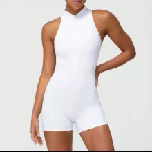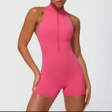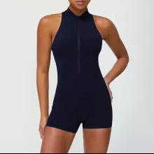 This jumpsuit is crafted from a premium blend of nylon and spandex, giving you just the right amount of stretch while offering a snug, supportive fit. The smooth knit fabric feels soft against your skin and resists wrinkles, shrinking, and pilling—so it keeps its shape and sleek look, workout after workout. The sleeveless design and short cut allow for full mobility, while the front zipper makes it easy to slip on and off without hassle.