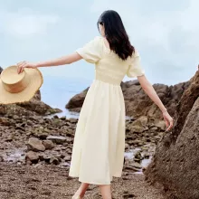 This dress is not just another piece of clothing – it’s an essential addition to your wardrobe. The contrasting color design gives it a vibrant and refreshing look, perfect for days in the sun or evenings out with friends. The puff sleeves add volume and fun, while the square neckline keeps things chic and modern. The slim fit profile enhances your figure, making it a flattering choice for a wide range of body shapes.
